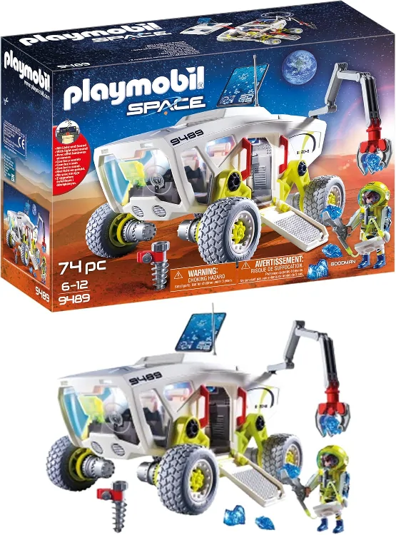 PLAYMOBIL Space 9489 Pojazd badawczy na Marsie to zestaw inspirowany prawdziwymi misjami kosmicznymi. Zawiera pojazd z oświetleniem LED (działa na baterie), dwie figurki astronautów i liczne akcesoria badawcze. Dziecko może symulować zbieranie próbek skał, analizę terenu i powrót do bazy. Wysoka jakość PLAYMOBIL gwarantuje bezpieczną zabawę i długowieczność elementów.